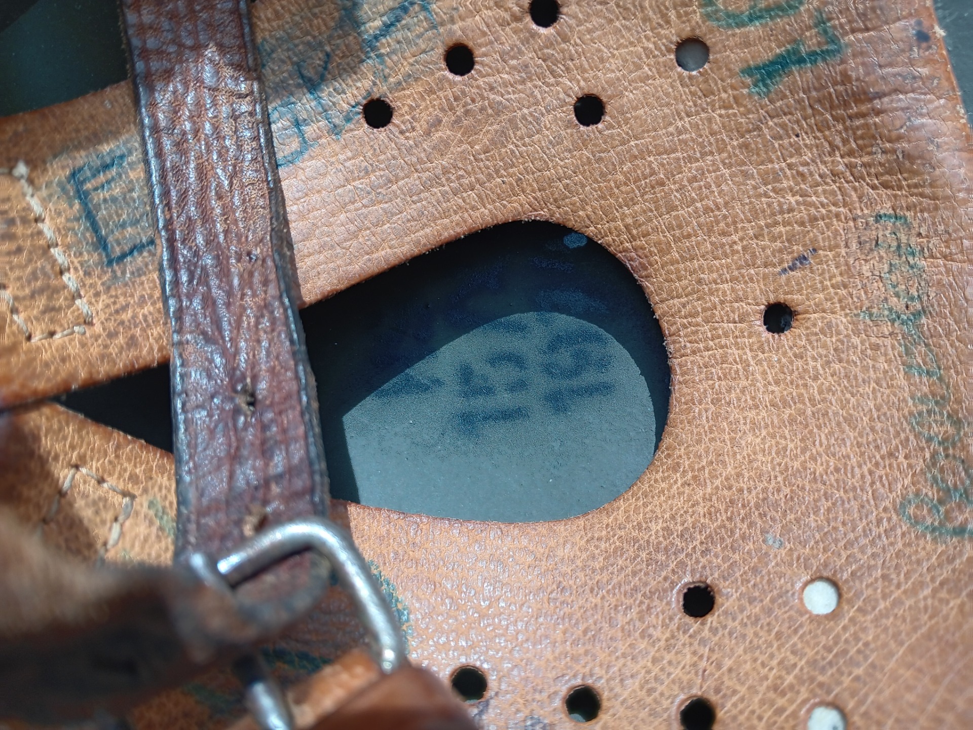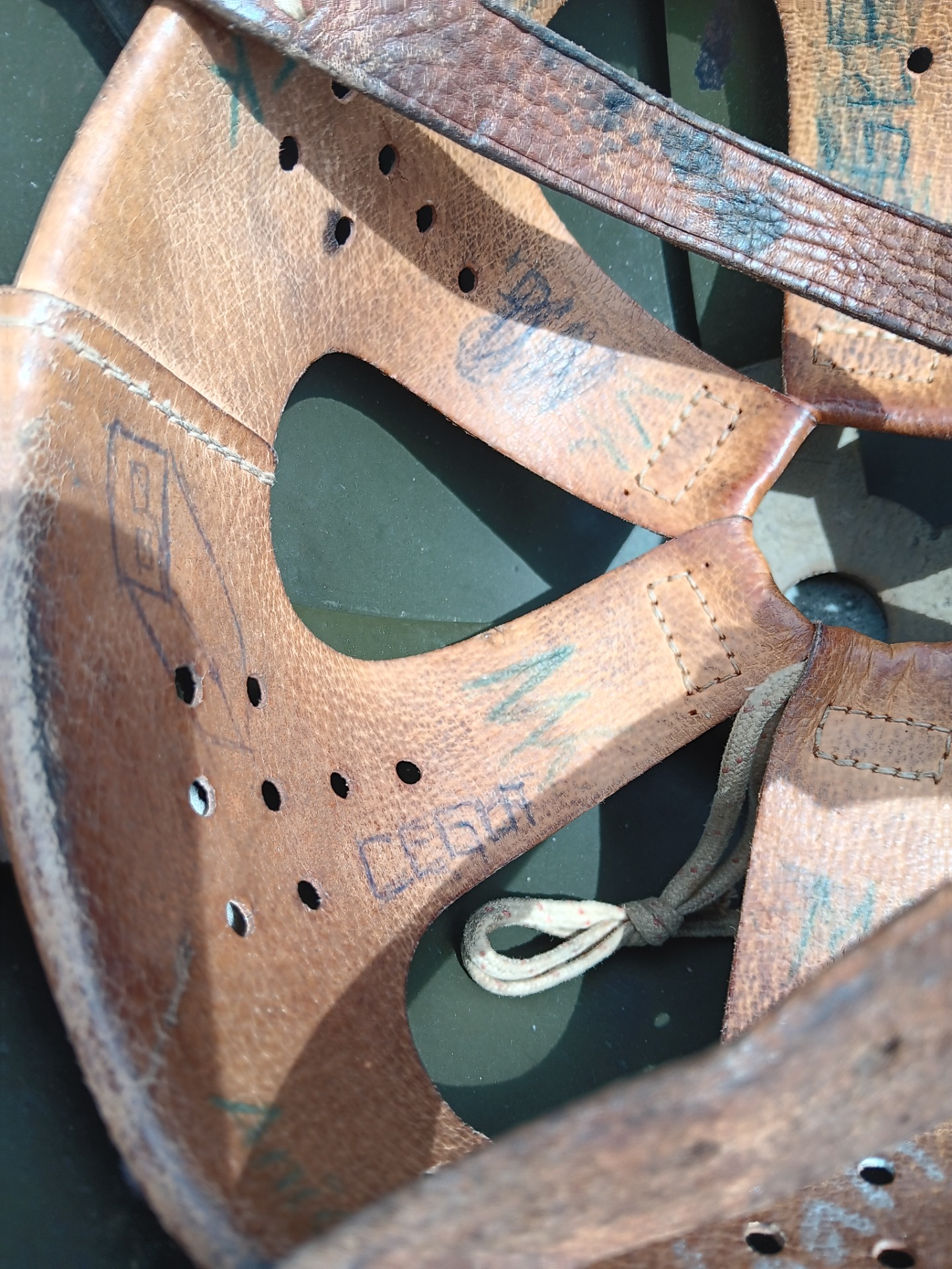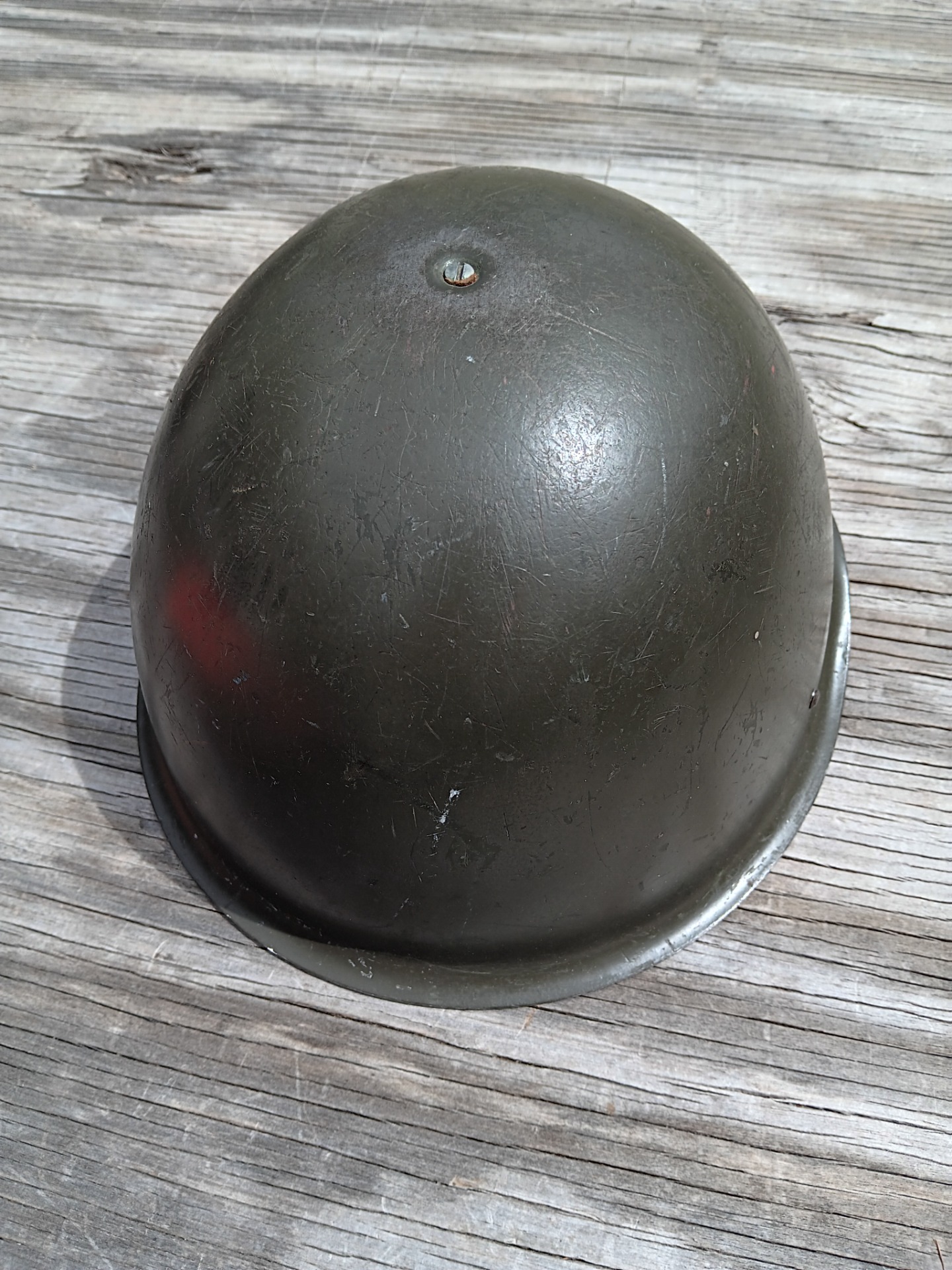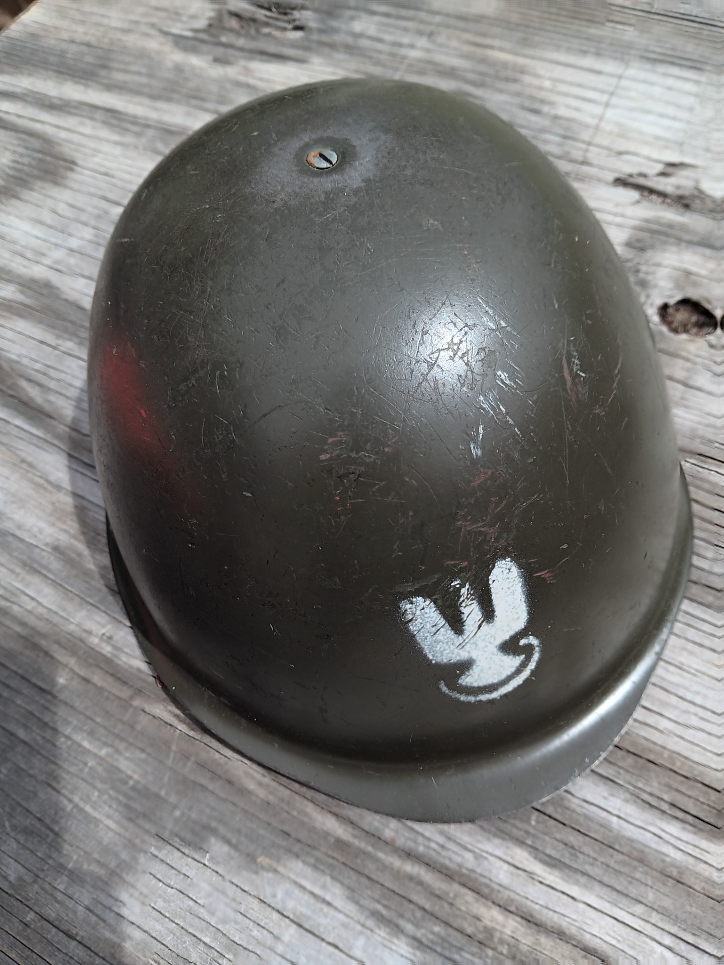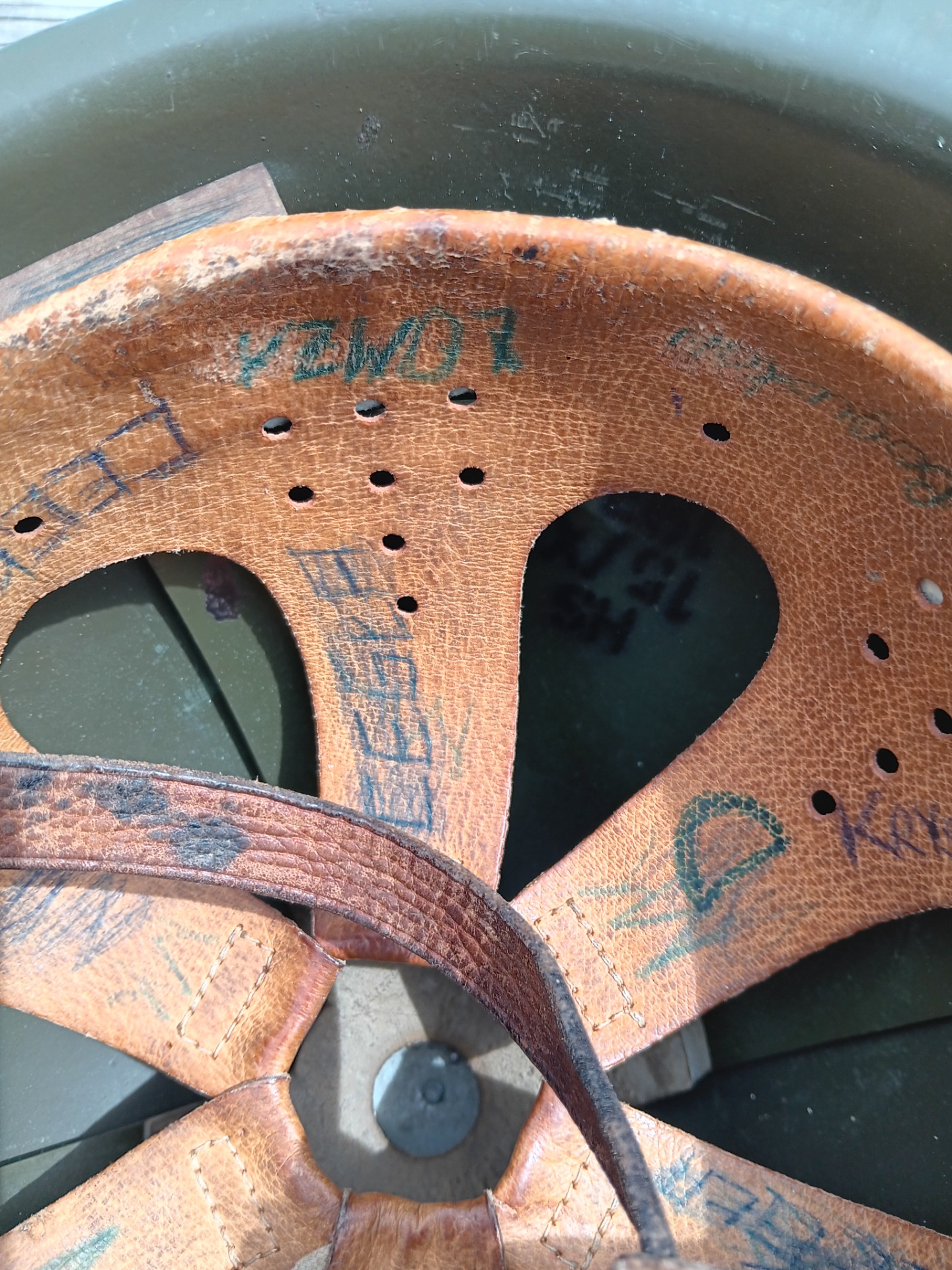 This helmet has all the places the soldier who was wearing it went. dated 1974.